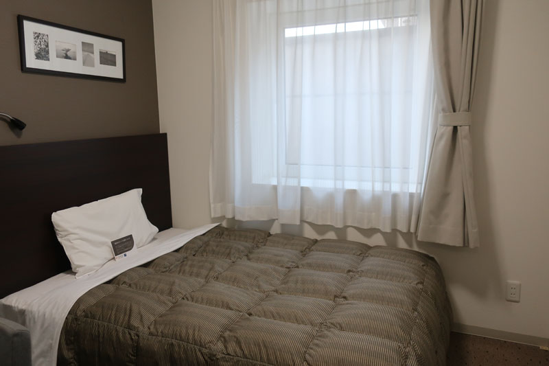 ホテルに入り、チェックインをして部屋に入る。部屋は綺麗でベッドも広い。これで駐車場込み3,800円(税込み)だから相当安い。 |