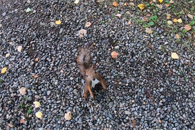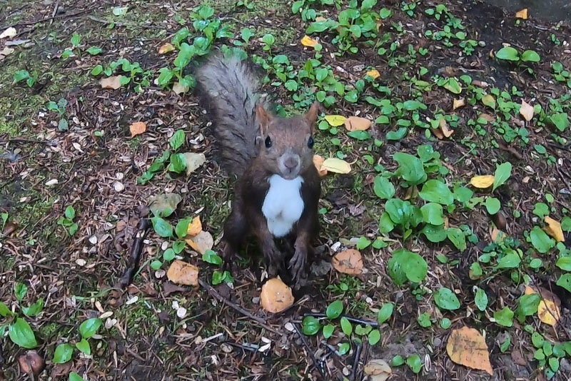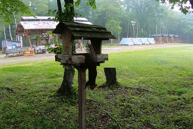 | リスは1匹だけではなく何匹もいて、しかも人懐っこいのでとても可愛い。動きがかなり俊敏なので、記録に残すならデジカメではなくアクションカメラ(GoPro)が便利。朝から楽しい動画が取れて大満足だ。 |