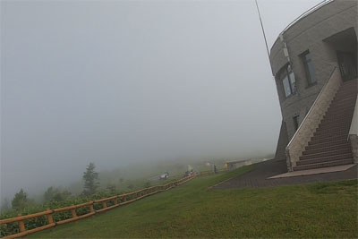 | 朝早く開陽台にやってきた。地球が丸く見える開陽台がキャッチフレーズだが、霧がまったく晴れずに周りが全然見えない。風で霧が流れているけど一向に消える気配がなく、1時間近く待機してみたけど状況が変わらず結局断念した。でも空は晴れている様子。 |