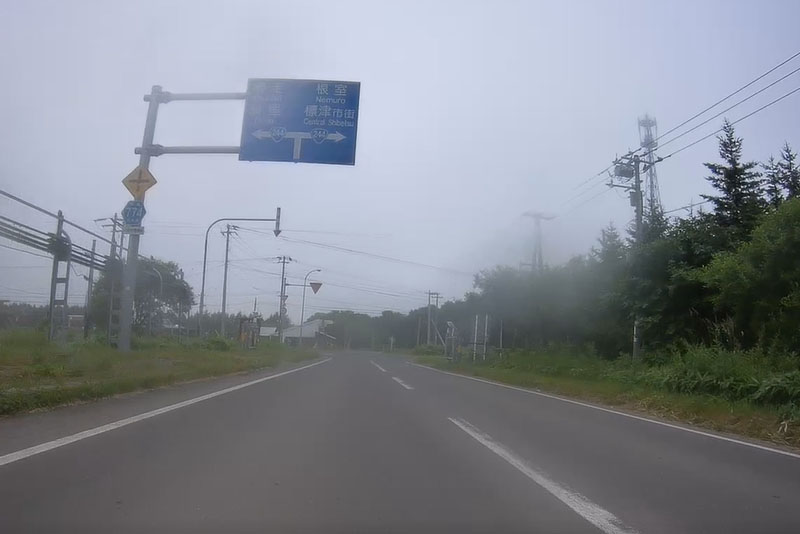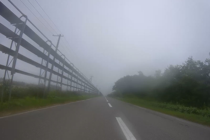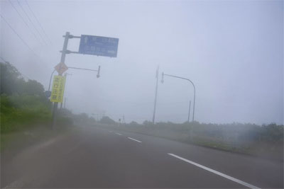 気を取り直して羅臼方面へ向かおう。開陽台から国道244号方面へ走るが霧が晴れない。路面が濡れていないから雨は降っていないと思うが、霧が凄くて天気もよくわからない。 |