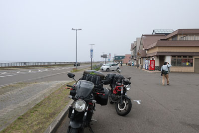 | 結局、霧の中、開陽台から70キロ走ってきて道の駅「知床・らうす」に到着。霧は晴れないままだったので景色が全然楽しめなかった。霧は曇りより遥かに性質が悪いぞ。 |