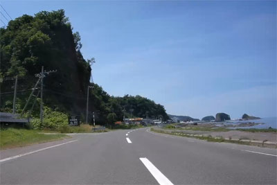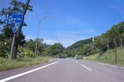 | 峠を降りると海が見えてきた。今日の天気予報は曇りだったと思うが、雲がほとんどない青い空。 |