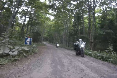 いきなりダート。これが2キロもあるって本当に先に進めるのか自信がない。でもここでバイクを置いて歩いていくわけにもいかず、とりあえず荷物満載のSV650で進んでみよう。(相棒は体格が良くて荷物が少ない上、ボクより小型のVTRなので余裕綽々でちょっと悔しい) |