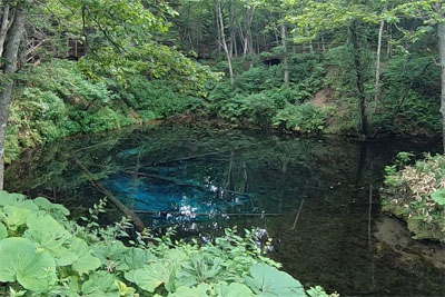 | ここの水は摩周湖から来ているとのことだが、池の中の木は腐らないらしい。そして青い色が特徴。日光の度合いによって青の色が濃くなったり薄くなったりするからこれも不思議だよね。 |