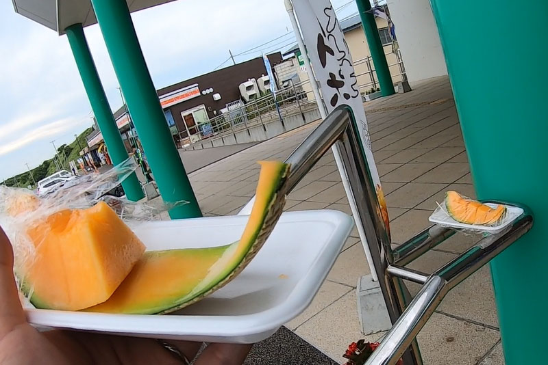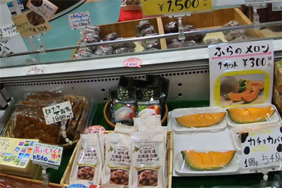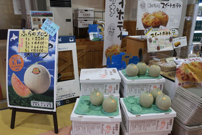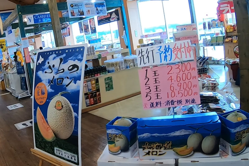 | 道の駅に行き過ぎたので中もどれも同じように思えるよ。でもさっきの道の駅にあったまったく同じメロンがこちらの方が高い。あちらは税込みで2200円。こちらは税別で2300円。サイズは同じと思う。 |