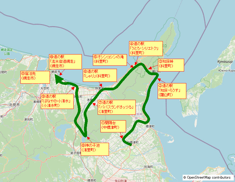 | オシンコシンの滝から網走まで。知床は北上すれば知床五湖やカムイワッカ湯の滝(ただしダート道)があったのでもう少し北上してみても良かった。知床遊覧船は今回は時間が合わなかったけど、次に北海道に来る機会があれば巡りたい。 |