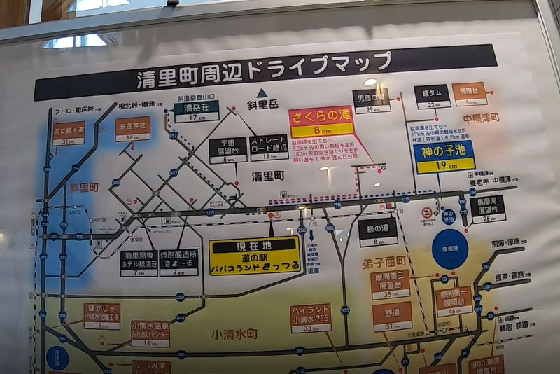 | 清里町の案内図。ここから神の子池まで19キロだが、池までダート(砂利道)2キロの記載が!おっと、完全に見落としていたが荷物満載のSV650で行けるのか、心配になってきた。 |