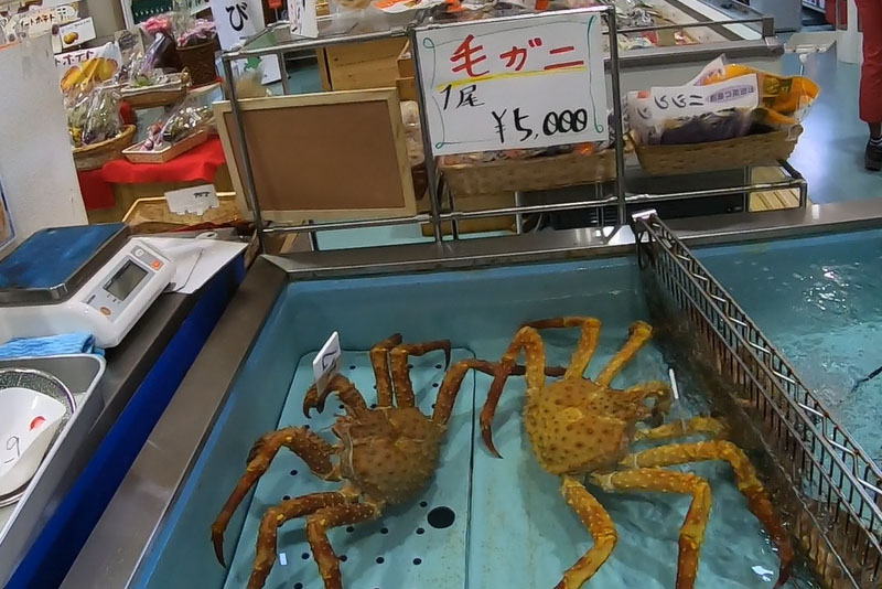 そしてカニも生きたまま売っているよ。この大きさで1匹5000円とはかなり安いと思うが、こんなデカいのをどうやって持って帰るのだろうか。 |