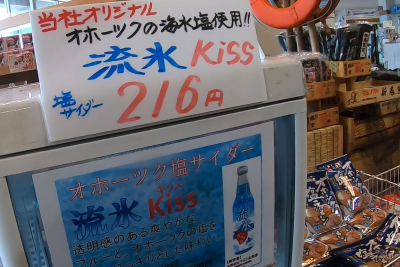網走らしく流氷の文字。オホーツク塩ラーメンは店員さんが熱心に進めてくれたが、バイクだと買えないのでパス。マツコ・デラックスのおススメらしいがテレビはまったく見ないし興味もないのでね。 |