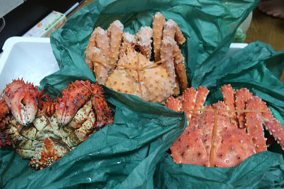 恒例のカニです。前回と比べるとカニが小振りですが、家族3人で食べるとちょうどいいサイズです。イバラガニ、タラバガニ、花咲ガニです。 |