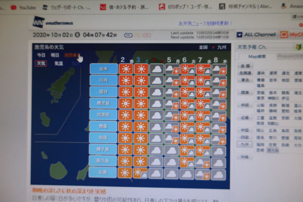 初日の10/2(金)から鹿児島の天気は快晴。九州北部から天気が崩れるようですが、九州南部は週末も基本快晴で天気も追い風。