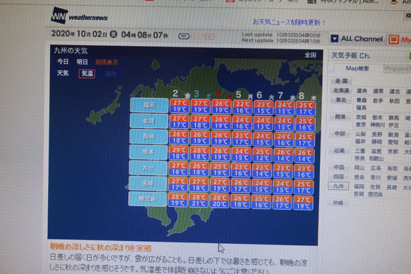 この時期の昼間はまだ暑いですが、夜間や早朝は結構冷え込むので服装に迷います。しかし、昼間に汗だくになるのは辛いのでメッシュジャケットにして朝晩はインナーウェアを着込むことにします。予想気温を見ると鹿児島は福岡より2~3℃は高いですね。さすが南国。真夏の道北(北海道)よりは全然暑いのでメッシュジャケットで大丈夫でしょう。