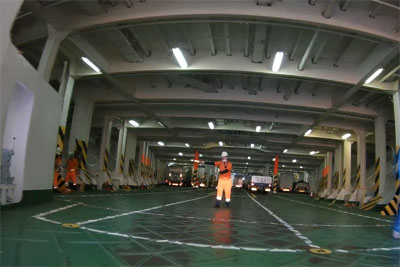 係員に案内されて乗船。バイクでフェリーも数えきれないぐらい乗ってきているので、ボクも既に慣れた感じではある。 |