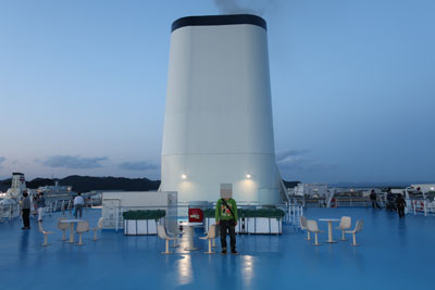 | 甲板にて。定刻通り17:30に出航。やっぱり新日本海フェリーの「はまなす」よりは開放感がある。あちらは輸送メイン。こちらも輸送メインではあるが、徒歩での乗船客もそれなりに多いからか。 |