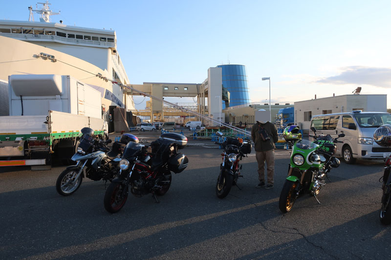 | 乗船までしばし待ち。夏に舞鶴から乗った新日本海フェリーと比べるとバイクの数は大分少ない。フェリー「いずみ」に乗るのは大阪からSV650を納車した2019年2月以来。 |