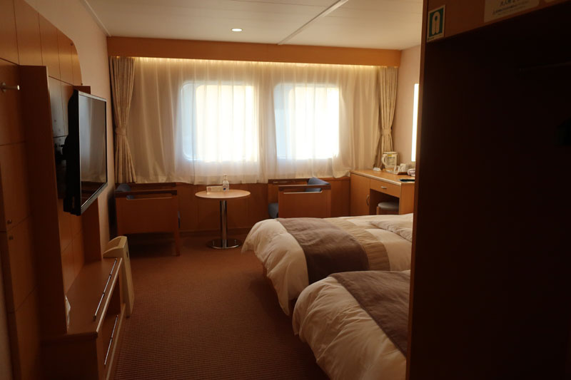今回は部屋を豪華にスイート(2人部屋)の貸し切りにしてみた。通常、スイートを貸し切る場合は追加で部屋の半額料金を払う必要があるが、今は阪九フェリーのキャンペーンでスイート貸し切り料が無料になっているのと、GoToキャンペーンで本来18,980円(スイート