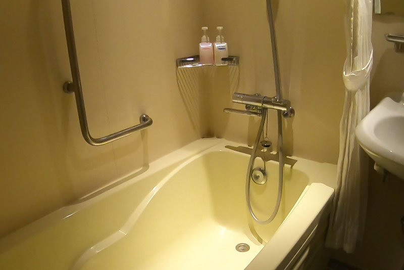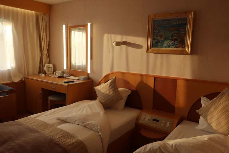 スイートルームへ。ビジネスホテルのツインそのもので1人で使うにはかなり贅沢。飛行機や列車、バスでは絶対ない広さで移動式ホテルといったところ。トイレと風呂もあるので、わざわざ部屋を出る必要もない。 |