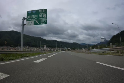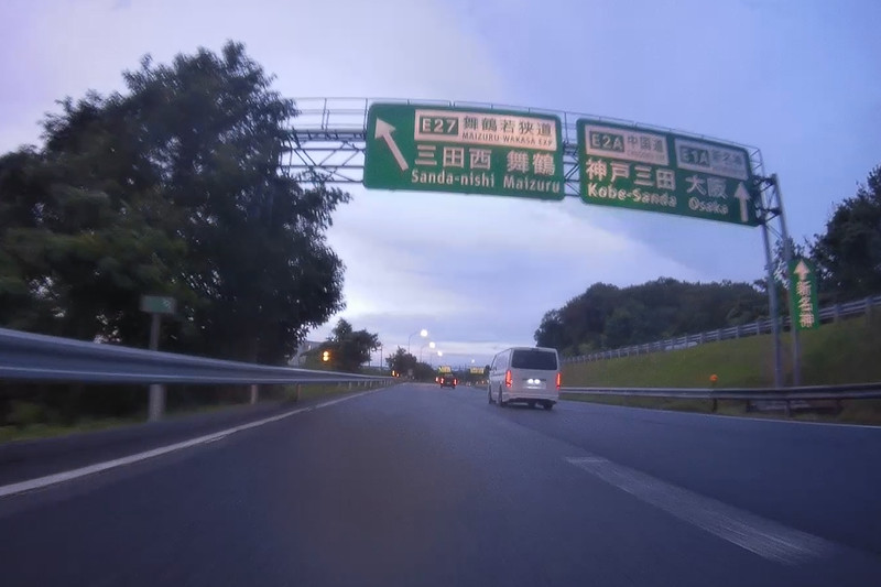 19:07に舞鶴自動車道へ分岐する吉川(よかわ)ジャンクションに入る。相当のハイペースでここまで来た。舞鶴港まであと90キロ。 |
