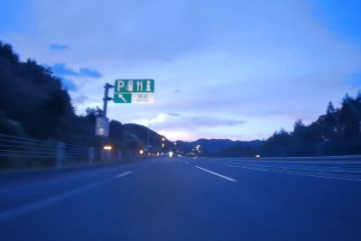 西紀サービスエリアを通過する。19時20分を過ぎて陽が落ちたが、まだかろうじて明るい。去年、ここのサービスエリアで休憩したときは既に真っ暗だった。 |