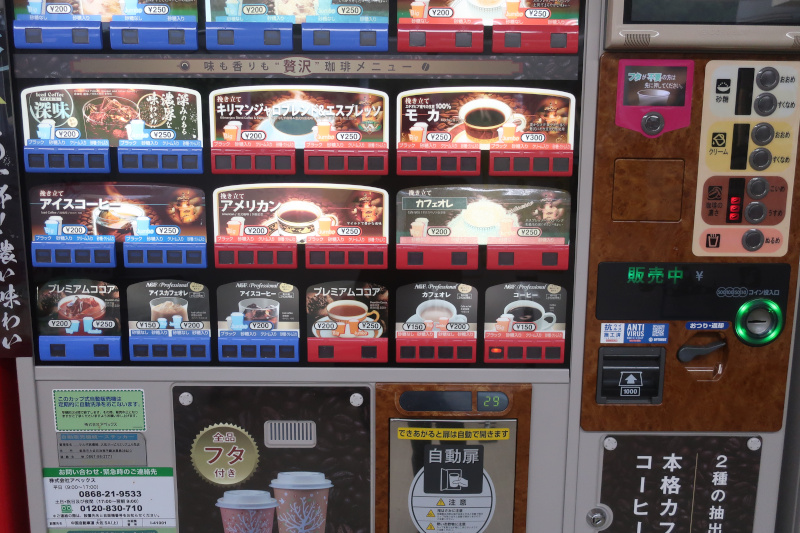 コーヒーを飲んでしばし休憩。ドリップするタイプの自販機だが、値段の割りに味はイマイチ。つい、コンビニコーヒーと比べてしまうが、あちらは相当優秀だからね。ただ、この自販機は蓋が付いて出てくるのでそこは素晴らしいと思う。 |