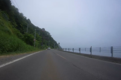 国道229号で積丹半島の海に沿って進む。海が見えてきたが未だに雲が厚くて景色が映えない。