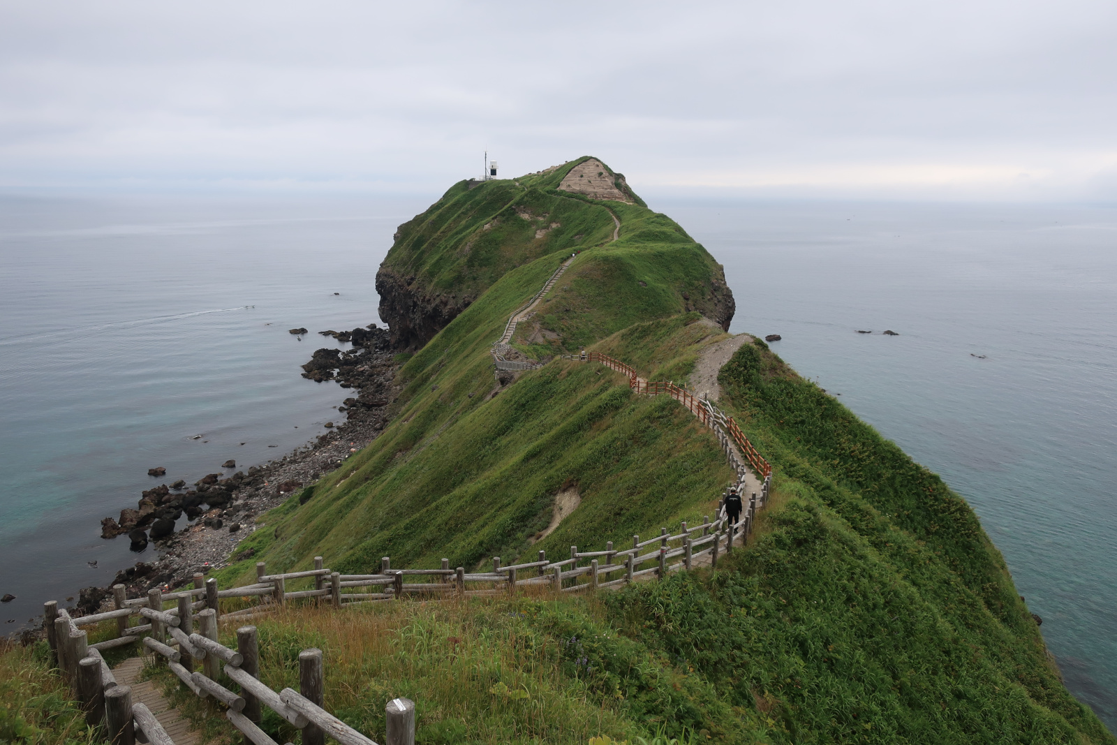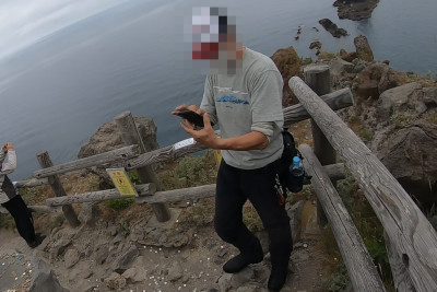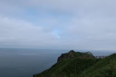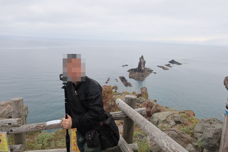 神威岬にて。先ほどのZ900RSのライダーに写真を撮ってもらった。青空でないのが残念だがここからの景色は抜群で北海道随一の絶景ポイントと言われるのも頷ける。神威(かむい)とはアイヌ語で神の威光という意味らしく、ここはその風貌から古くから神聖化されてきた場所らしい。