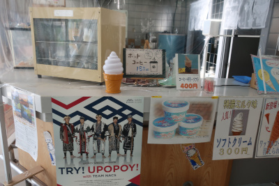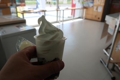 中に入ると定番のソフトクリームが。ちょうど暑かったし食べたくなるが、ここで食べると昼食が・・・