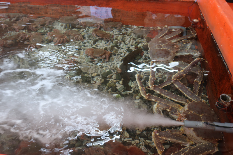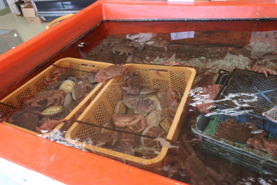 水槽には新鮮なカニや帆立が多数いて見ているだけで面白い。北海道といったらやっぱり海の幸だね。