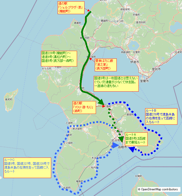 蘭越町~黒松内町~長万部~森町と走ってきた。このまま真っ直ぐルートA(国道5号)で函館に向かってもいいが、時間が余っているのでルートB(国道278号、渡島半島右)かルートC(渡島半島左)を走るルートを検討する。ルートCの距離を計算するとさらに200キロぐらい走らないといけないので少し厳しく、他はルートA+五稜郭見学かルートBだが、五稜郭は明日行けばいいので、このあとはルートBを走ることにする。