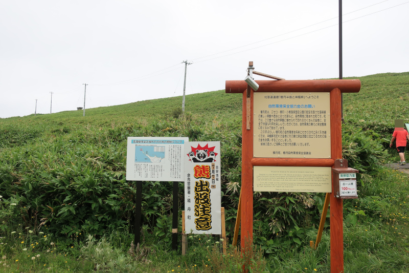 歩き始めるとすぐに目に入ったのが熊出没注意の看板。7月7日に出没したらしいが、出会ったらどうしようもない。次に北海道に来るときは熊除けスプレーを持参しておこう。