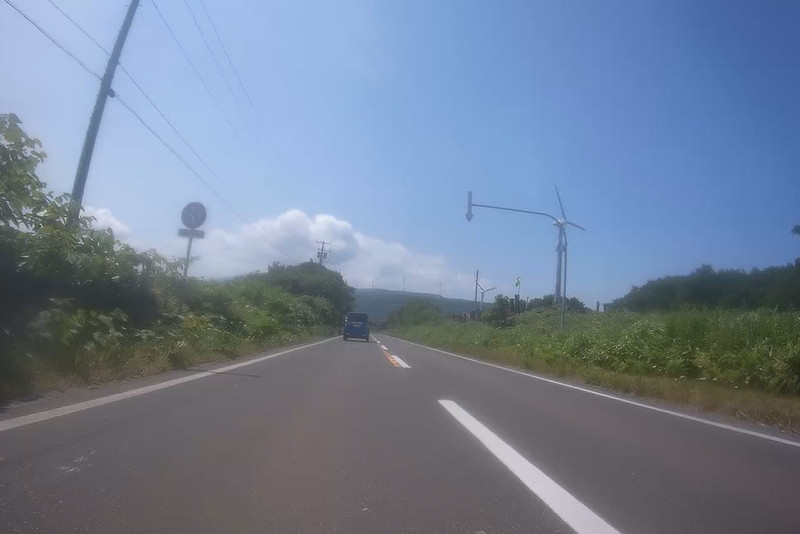 道の駅が近くなって風車が出てきた。長いトンネルを抜けた後なので若干レンズが曇り気味。
