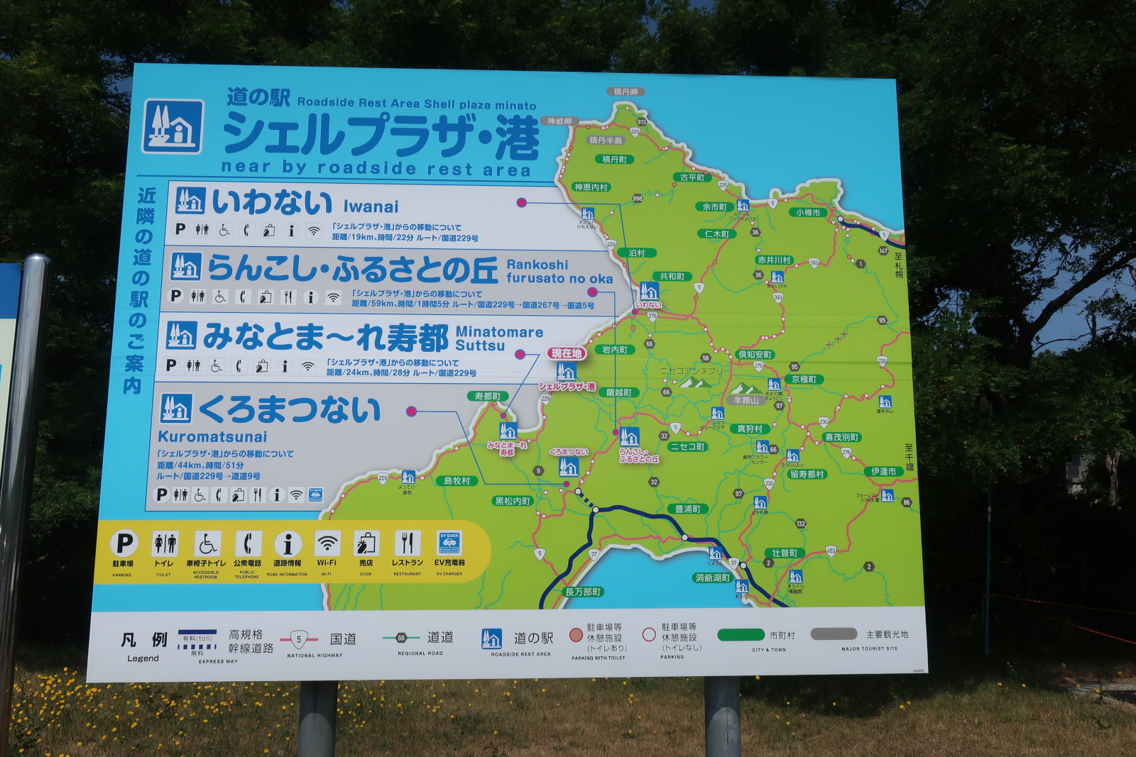 神威岬から道の駅「シェルプラザ・港」まで国道229号で南下してきた。ルートといってもそれほど選択肢はなくて、このあと直ぐに道道229号から蘭越町市街地に出て国道5号に出るルートA(橙)、寿都市街地まで走って道道9号から国道5号に出るルートB(緑)、長万部をパスしてそのまませたな方面に出るルートC(青)のいずれかになる。
