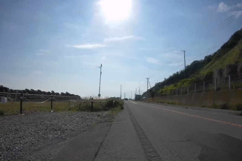 落部市街地まで抜けてきた。13時前で昨日と同じぐらい気温は高いが、海が真横にあるので風が気持ちよくて昨日のように水を頭から掛けないと走れないという状況ではない。海も右側より左側にあるほうがいいのかもね。(日本は左車線だからね。海岸線は時計回りが基本だけど本当にそう思う) クルマに乗っていたら海の方向など気にしないけど。