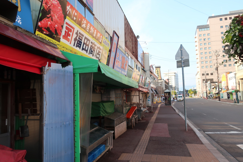 まだ17時半前なので少し外に出てみよう。ホテルの目の前には函館朝市の店舗が並ぶ。既に閉店しているが、明日は朝早くから開くだろう。