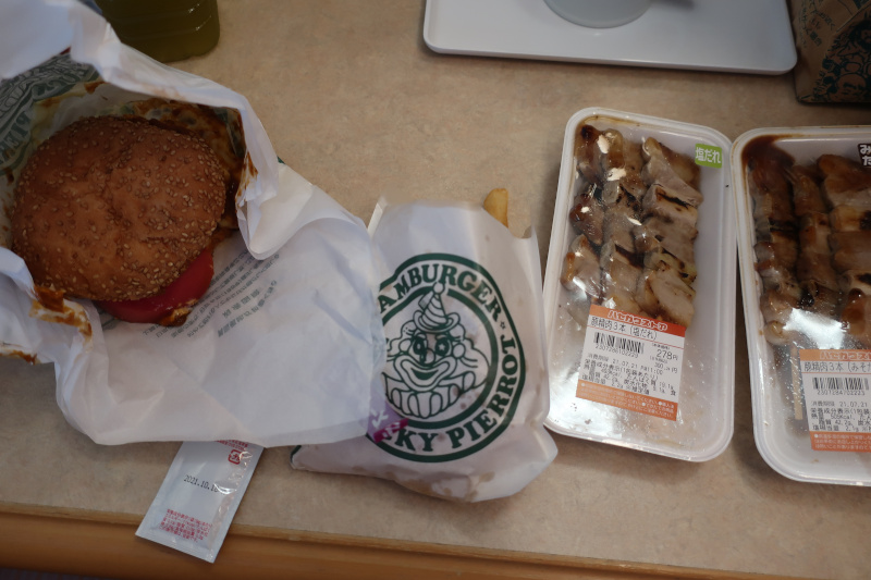 今日の夕食はテイクアウトでラッキーピエロのチーズハンバーガー+フライドポテトとハセガワストアの焼き鳥にしてみた。焼き鳥弁当まではさすがにボリューム的に厳しかったのでハセガワストアは焼き鳥だけ。