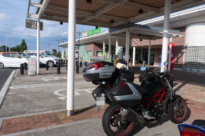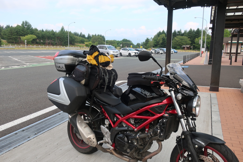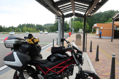 SV650も120km/h程度は余裕で出せるが、速度を上げると燃費が一気に落ちるので自重しながら走って前沢サービスエリアに到着。このサービスエリアの構造は少し変わっていて1階が駐車場で2階が店舗のようだ。 |
