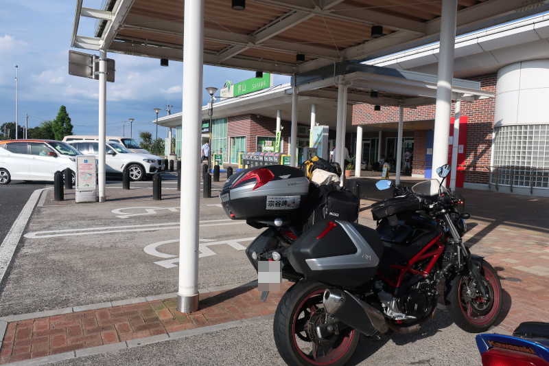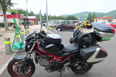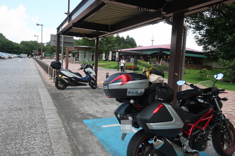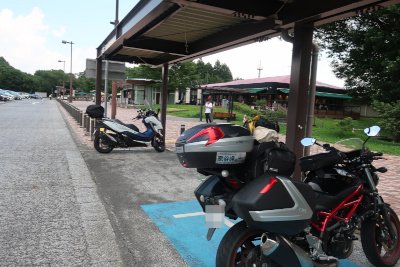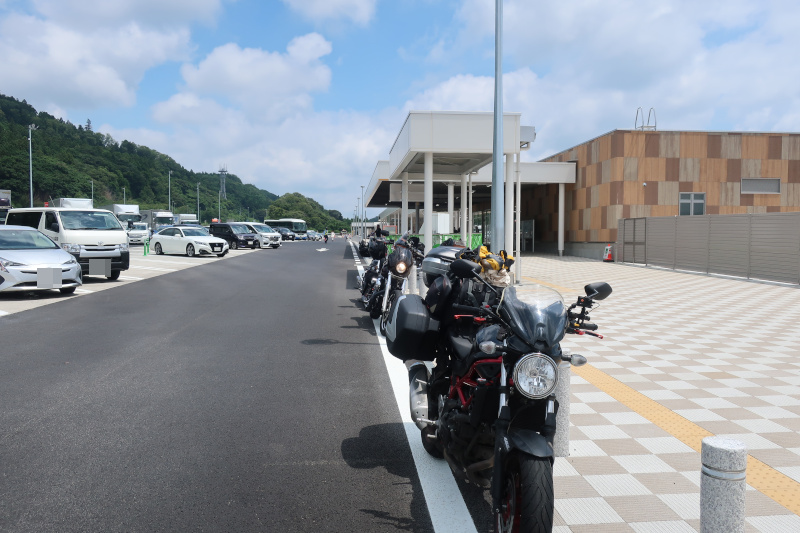 クルマが段々増えてきた。そのうちに安達太良(あだたら)サービスエリアに到着。関東圏のバイクが多くて1台だけ北九州ナンバーだと違和感がある。かなり暑くなっていて結構辛い。 |