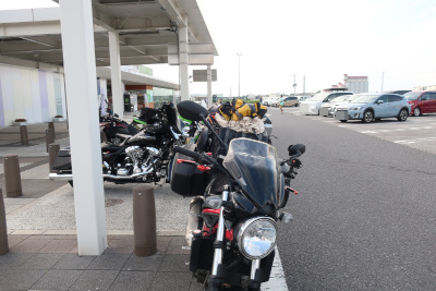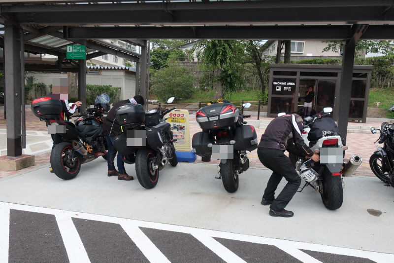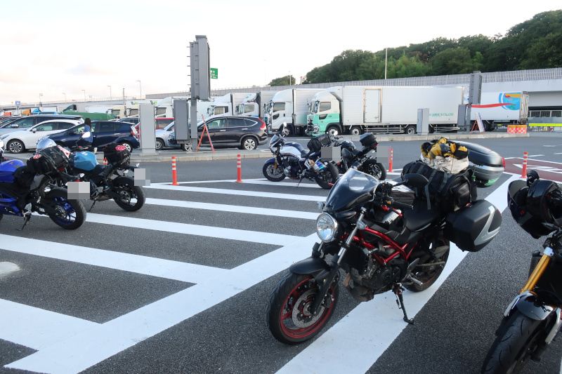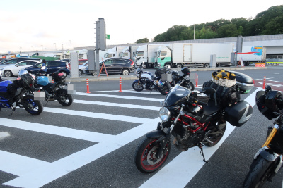 そして最後の休憩場所、厚木パーキングへ到着。周りのバイクがすべて関東ナンバーなのに横のバイク2台が北九州ナンバーなのでびっくりした。しかもフェリーの話をしているが、もしかして同じフェリーに乗るのだろうか? |