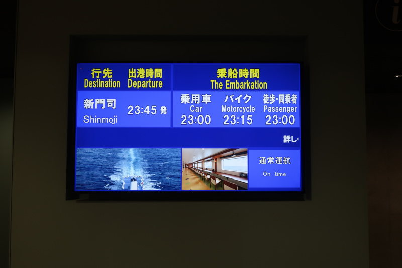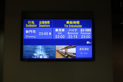 本当にここからフェリーが出るのか心配になるぐらい人がいないが、電光掲示板を見ると23:45出航、明日21時到着の案内があるので間違いない。 |