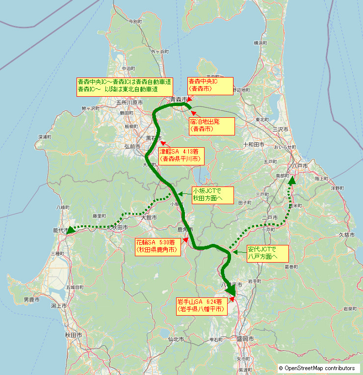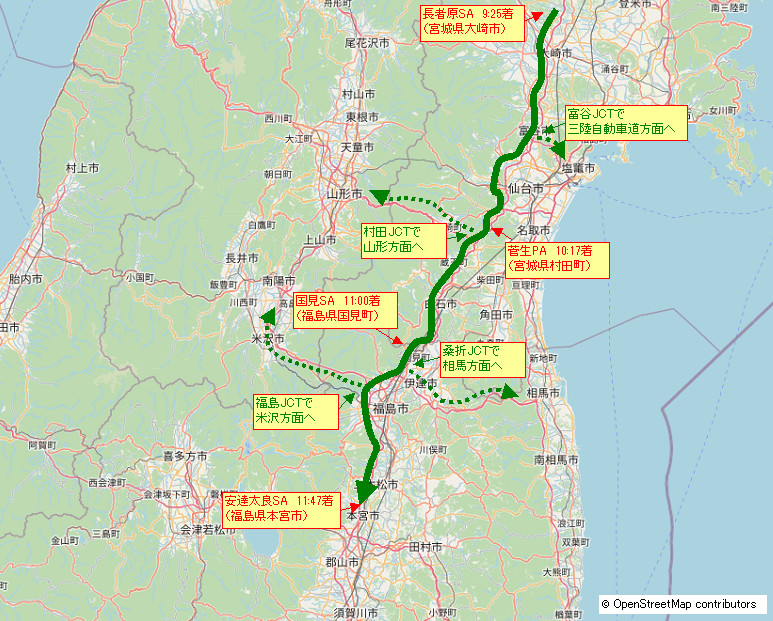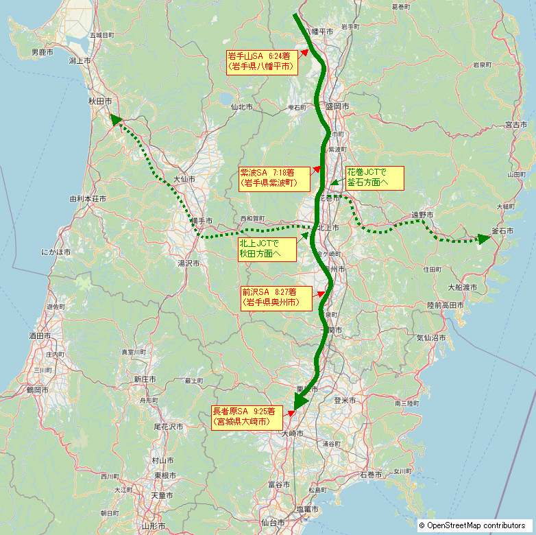 岩手山サービスエリアから長者原サービスエリアまで。岩手県を抜けてきた。大都市、仙台市はもう少し先。 |