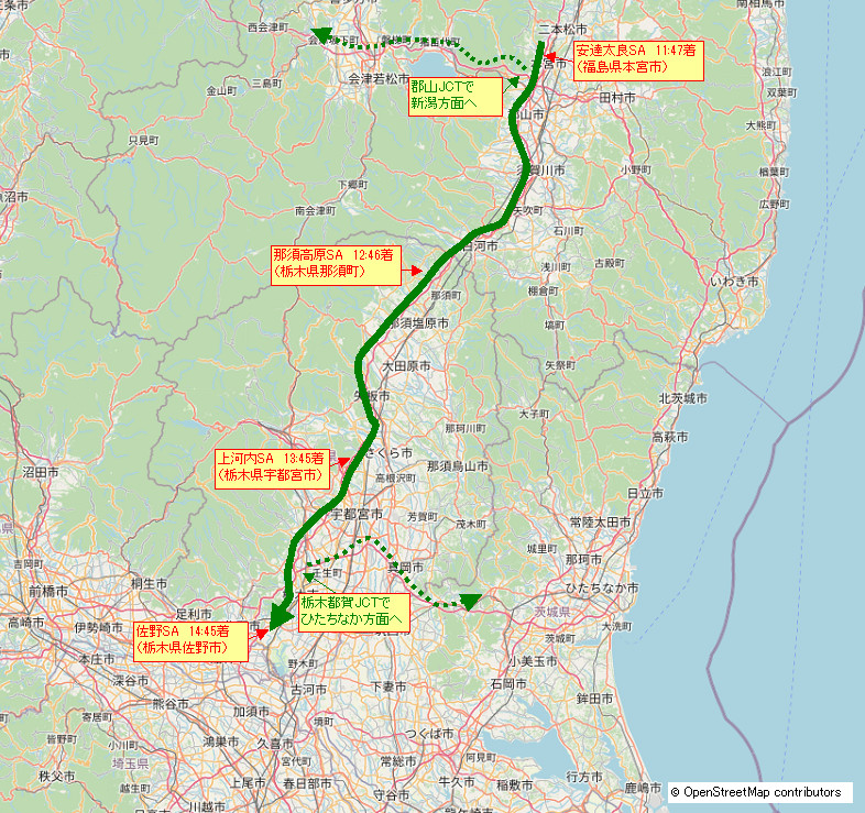 安達太良サービスエリアから佐野サービスエリアまで。栃木県に入って東京が見えてきた。 |