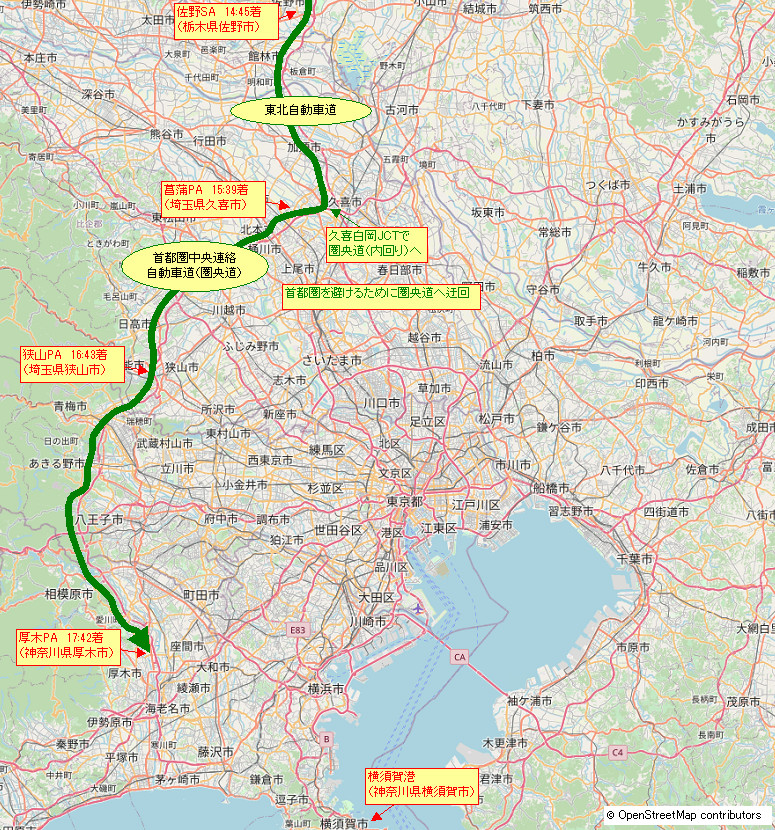 佐野サービスエリアから厚木パーキングまで。これで最後の休憩が終わった。あとは横須賀港に向かうのみ! |