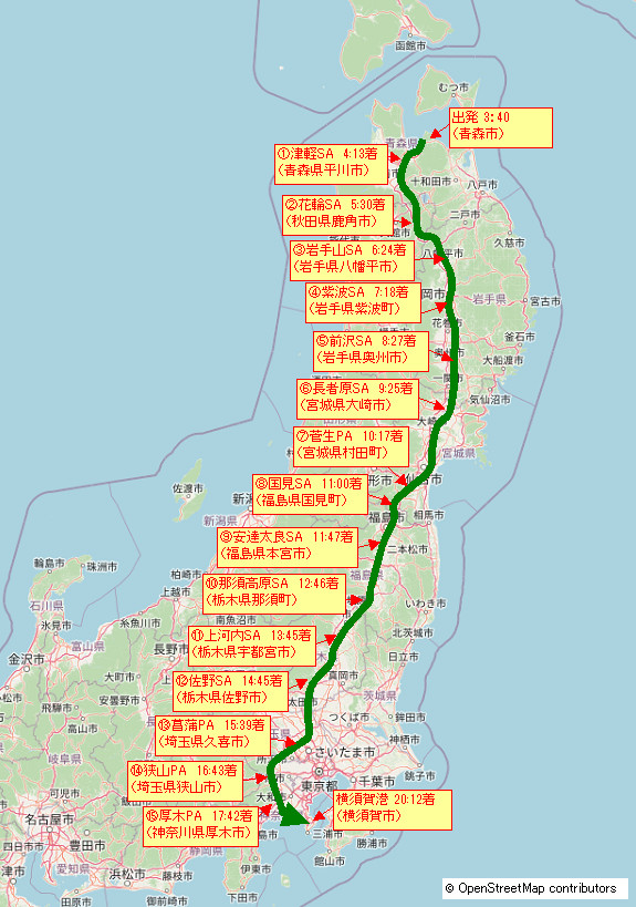 青森から高速道路をひたすら南下すれば10時間弱で横須賀まで行けるらしいので午前中(9時~)に出れば十分間に合う気がするが、今からすぐに高速道路に乗るためにいつもより早い起床にした。その理由は深夜割引。距離がある分、ここから横須賀までの高速料金も馬鹿にならないので4時までに高速道路に入って3割引きにしておきたい。ということですぐに出発しよう。 |