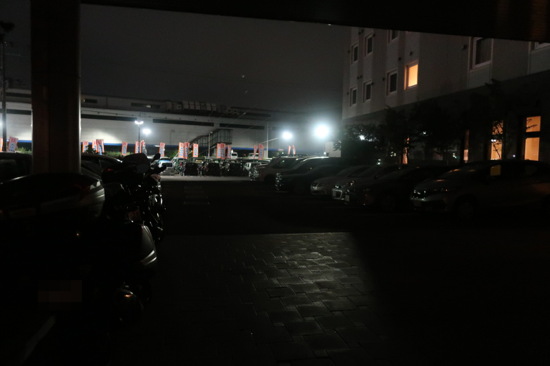 表に出るとバイクを置いている正面出入口の照明が消灯されていて荷支度ができない。