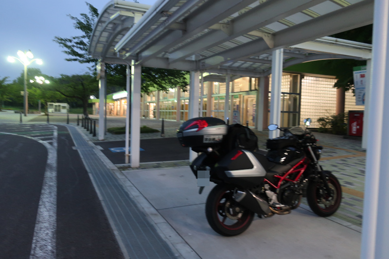 走っているとそのうちに雨が止んで視界が広がってきた。最初の津軽サービスエリアに停車する。まだ夜明け前で空は薄暗い。 |