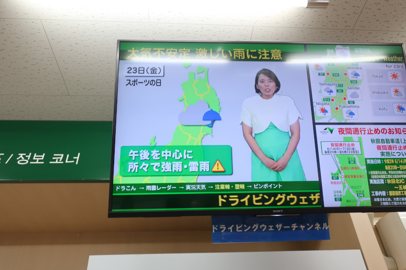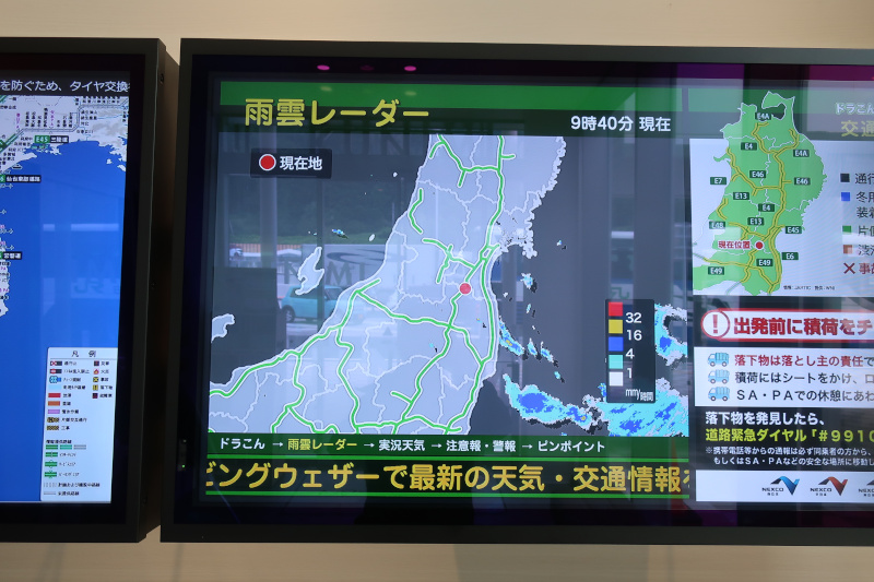 花輪サービスエリアを出発した後、工事中で片側一車線になった絡みで路面の標識が逆になって一時停止するトラブルがあったが、何とか岩手山サービスエリアに到着。 |