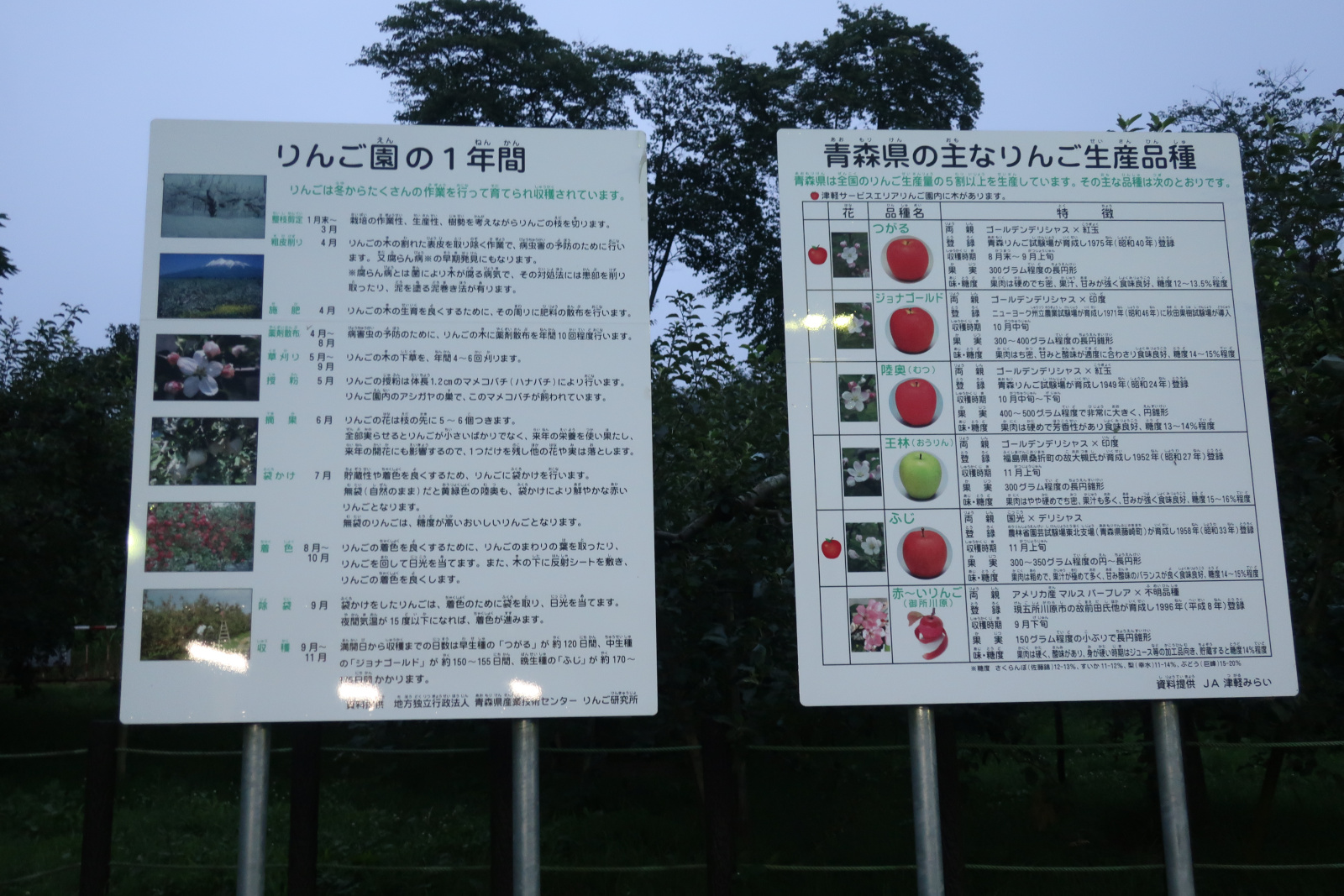 外に出るとりんご園の1年間とりんごの品種の看板が。青森といえばりんご。りんごは寒い場所でしか栽培できないから九州でりんご栽培という話はまったく聞かない。(調べてみると福岡や宮崎でも栽培しているらしいが、気候的に条件が厳しいらしい)