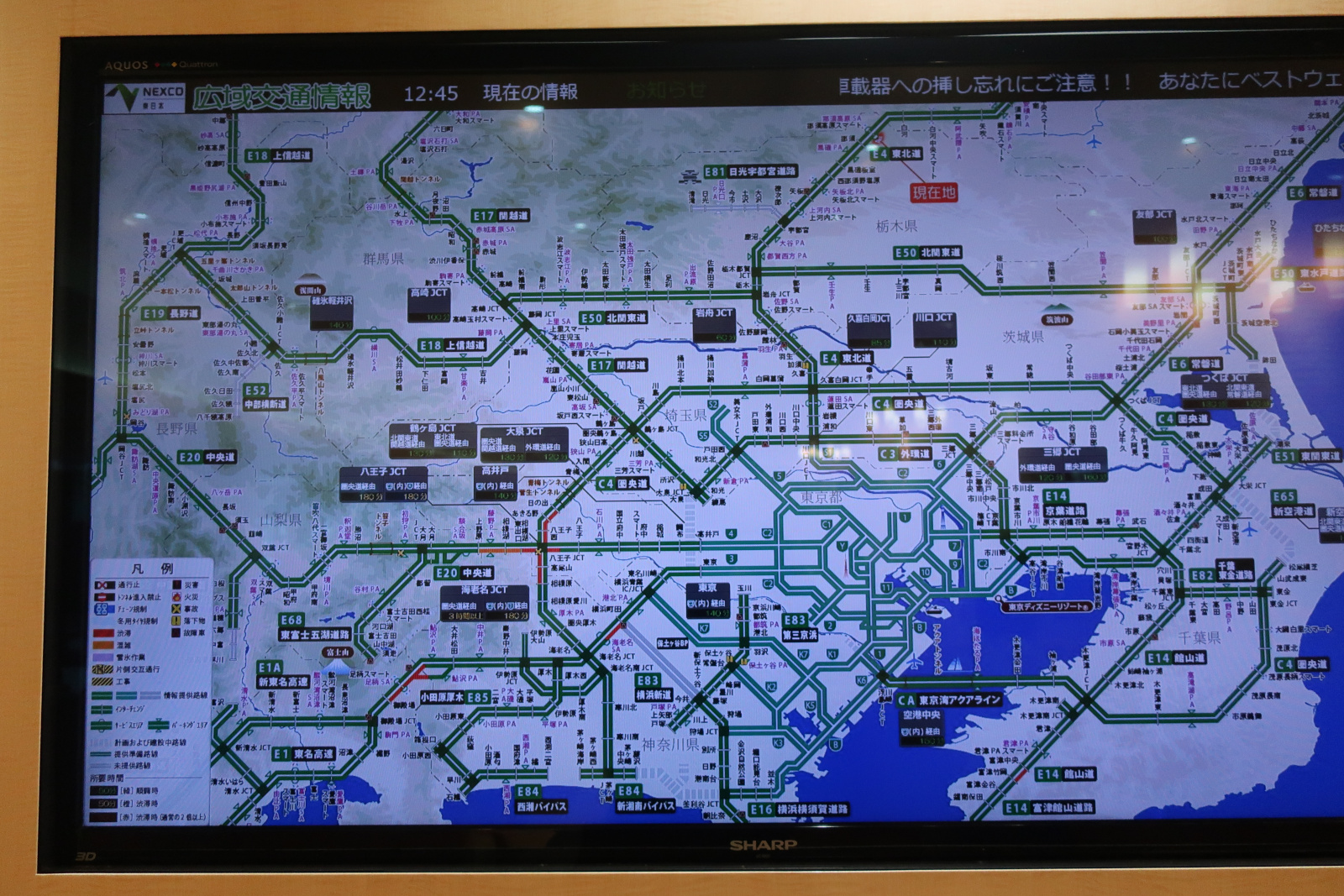 首都圏の高速道路情報。横須賀の文字が見えた!周辺の高速道は所々渋滞しているが圏央道に渋滞や事故はないようだ。このまま圏央道で八王子方面経由で茅ヶ崎に出る予定。 |