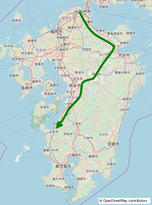 北九州折尾から出水市まで国道3号線を使えば一本道で行けますが、どうせ鹿児島に行くなら由布院から「やまなみハイウェイ」経由で行ったほうが楽しいだろうと思い、あえて遠回りして行くことにしました。