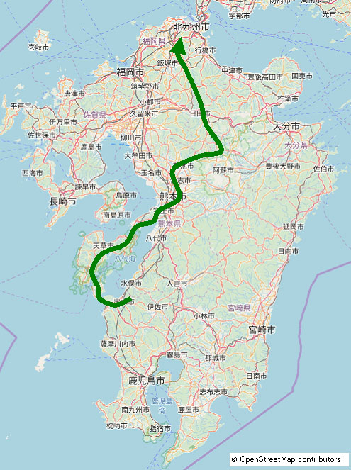 北九州、行橋、中津、宇佐、安心院、由布院、阿蘇、大津、益城、御船、甲佐、八代、水俣、出水、長島、天草、宇土、熊本、大津、阿蘇、小国、日田、小石原、飯塚、直方、北九州